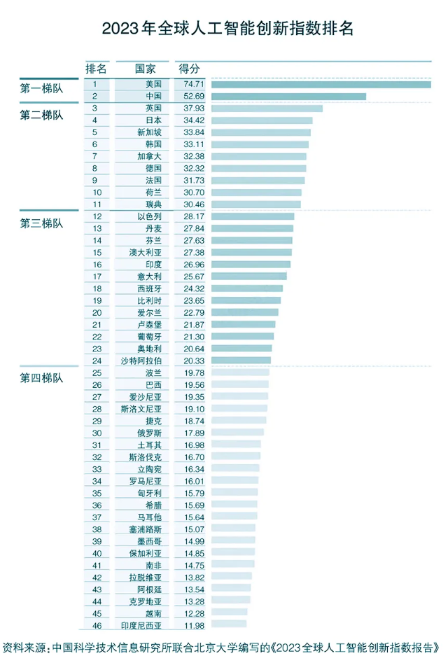 《報(bào)告》顯示,美國和中國穩(wěn)居第一梯隊(duì),總得分明顯高于其他國家,第二、三、四梯隊(duì)整體格局比較穩(wěn)定。自指數(shù)創(chuàng)建五年來,美國一直排名全球第一,中國從2020年起近四年一直排名第二。第二梯隊(duì)與第一梯隊(duì)的差距進(jìn)一步拉大。英國連續(xù)兩年位居第二梯隊(duì)首位。第三、四梯隊(duì)部分國家有所進(jìn)步。第三梯隊(duì)國家中,印度和沙特阿拉伯近四年的排名逐年上升。第四梯隊(duì)國家中,巴西和印度尼西亞等國家在科技研發(fā)和產(chǎn)業(yè)應(yīng)用等層面取得積極進(jìn)展,在人工智能開源項(xiàng)目數(shù)、人工智能風(fēng)險(xiǎn)投資額等指標(biāo)上排名中等以上。
